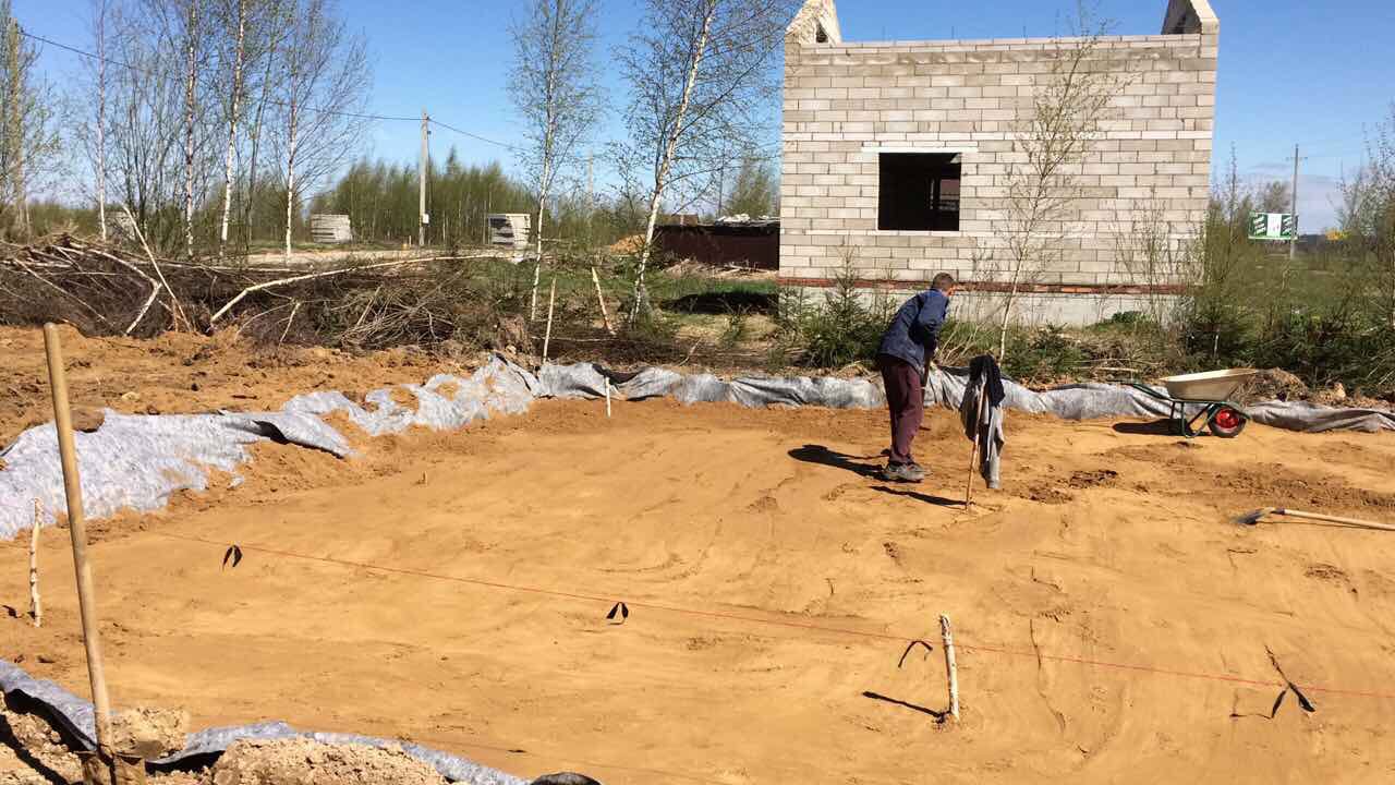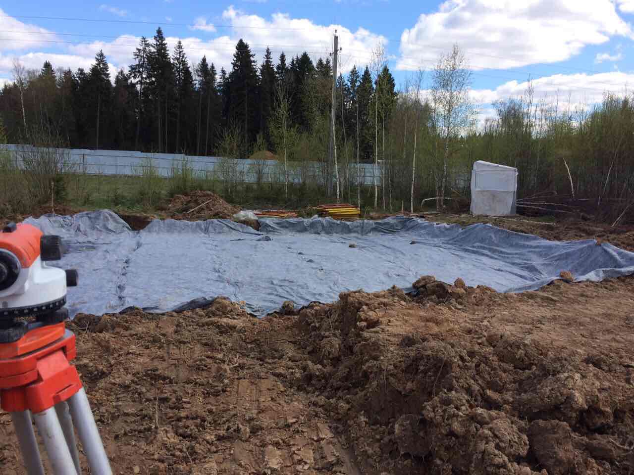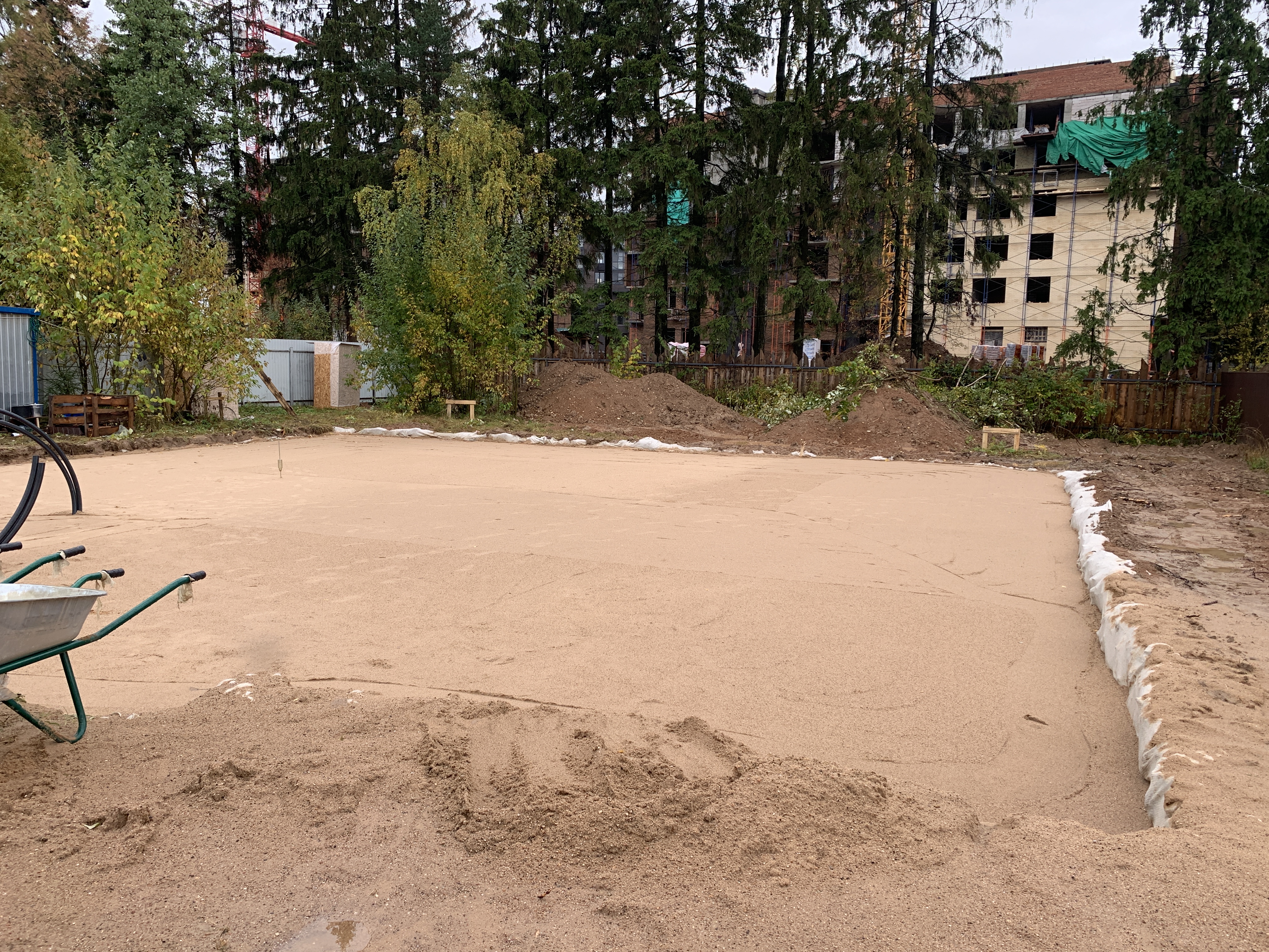 Поверхность котлована выравнивается, укладывается подушка из песка и гравия для обеспечения устойчивости и дренажа.