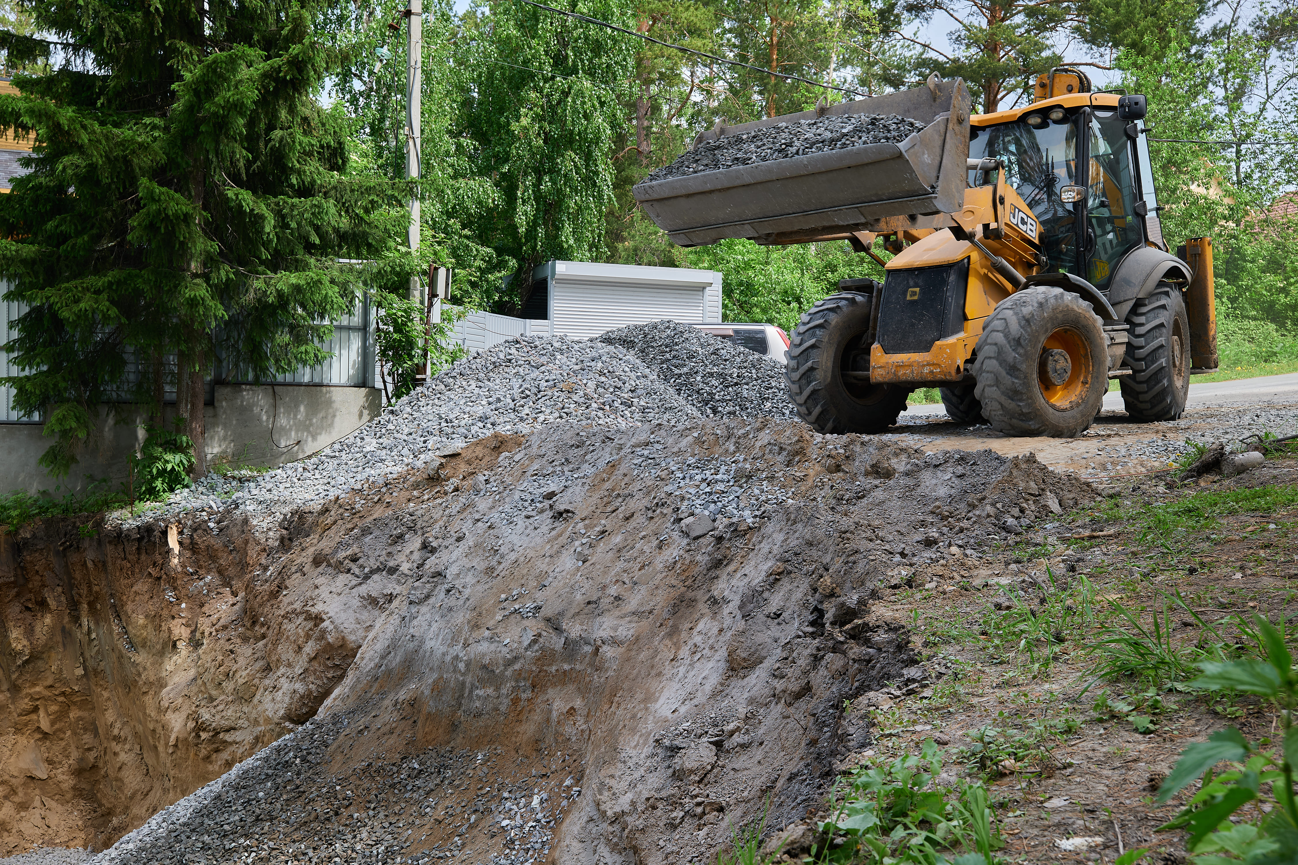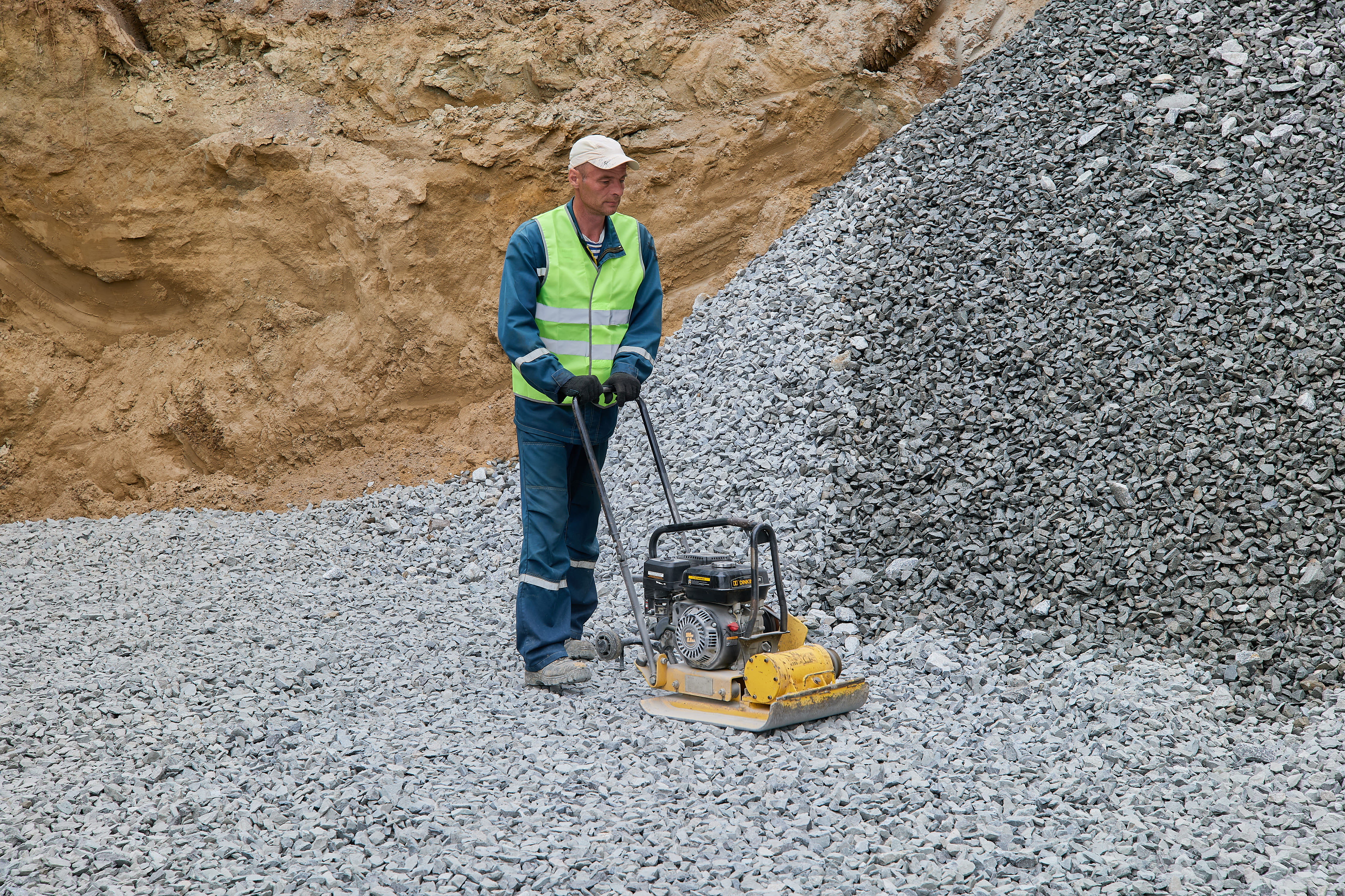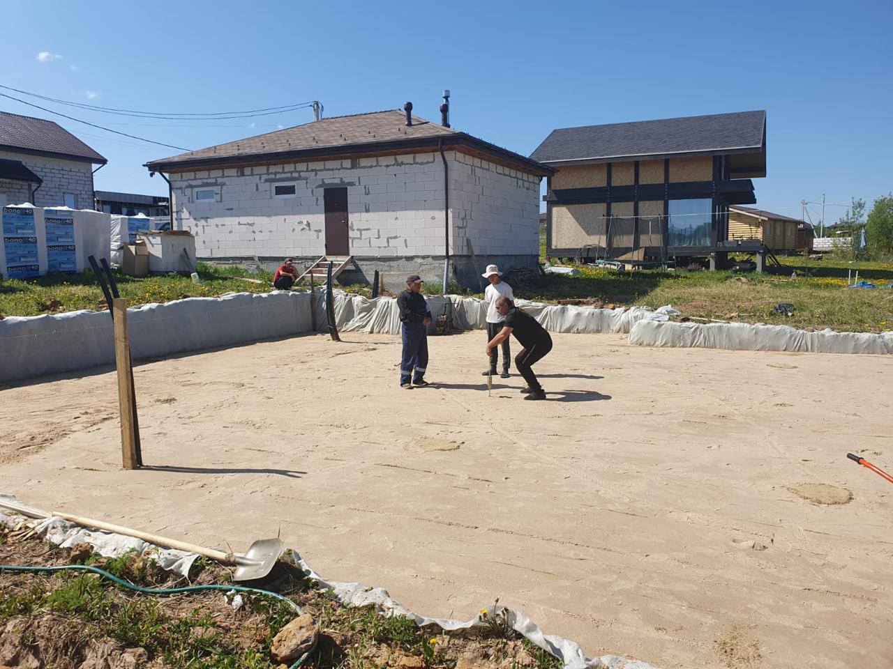 Поверхность котлована выравнивается, укладывается подушка из песка и гравия для обеспечения устойчивости и дренажа.