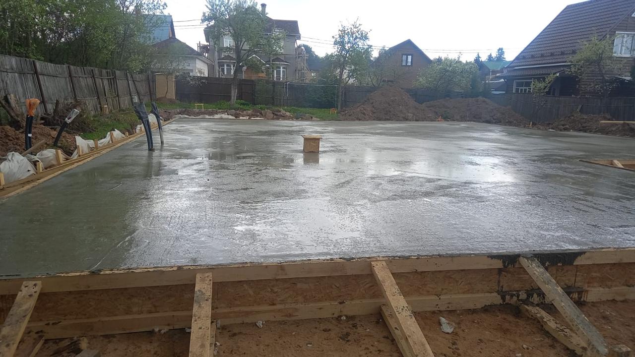 Бетон заливается в опалубку, тщательно разравнивается и уплотняется для удаления воздушных пузырей.